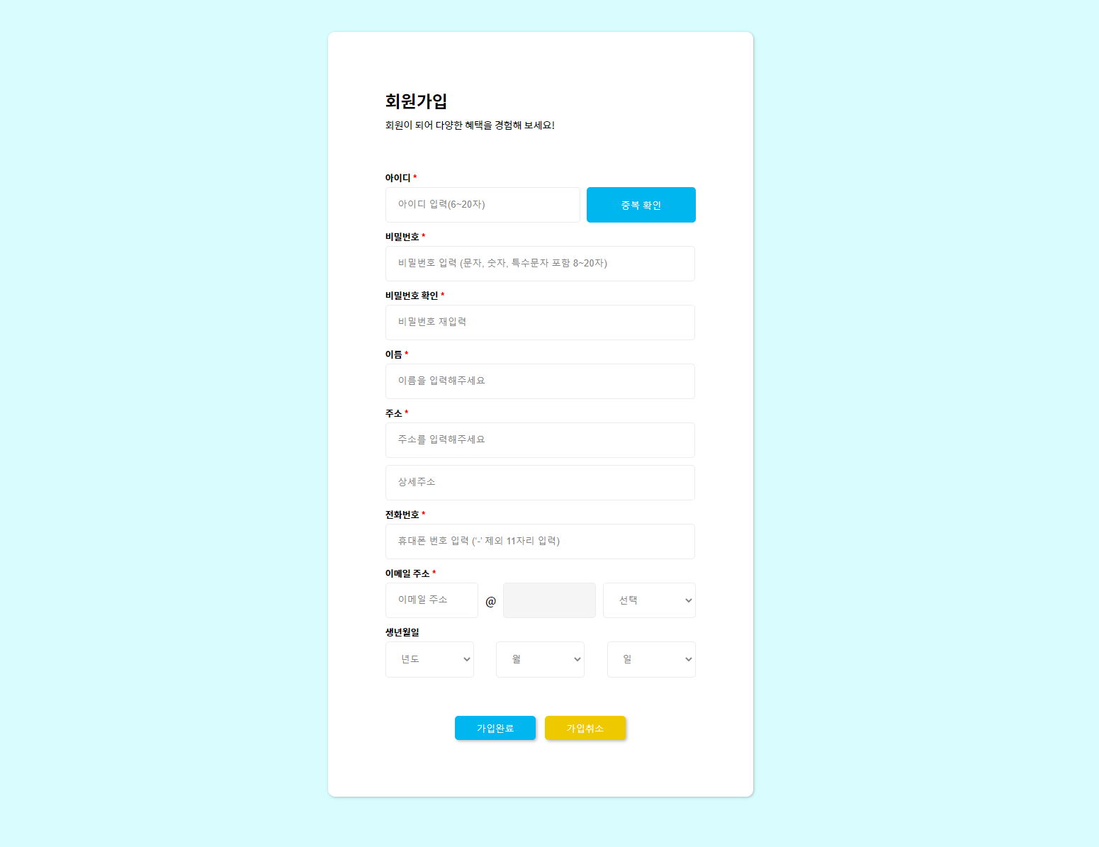 - 생년월일은 월만 HTML에서 Select로 했다가 (나머지는 input) 일관적으로 하고 싶어서 input만 두고 JS로 동적으로 바꿨다